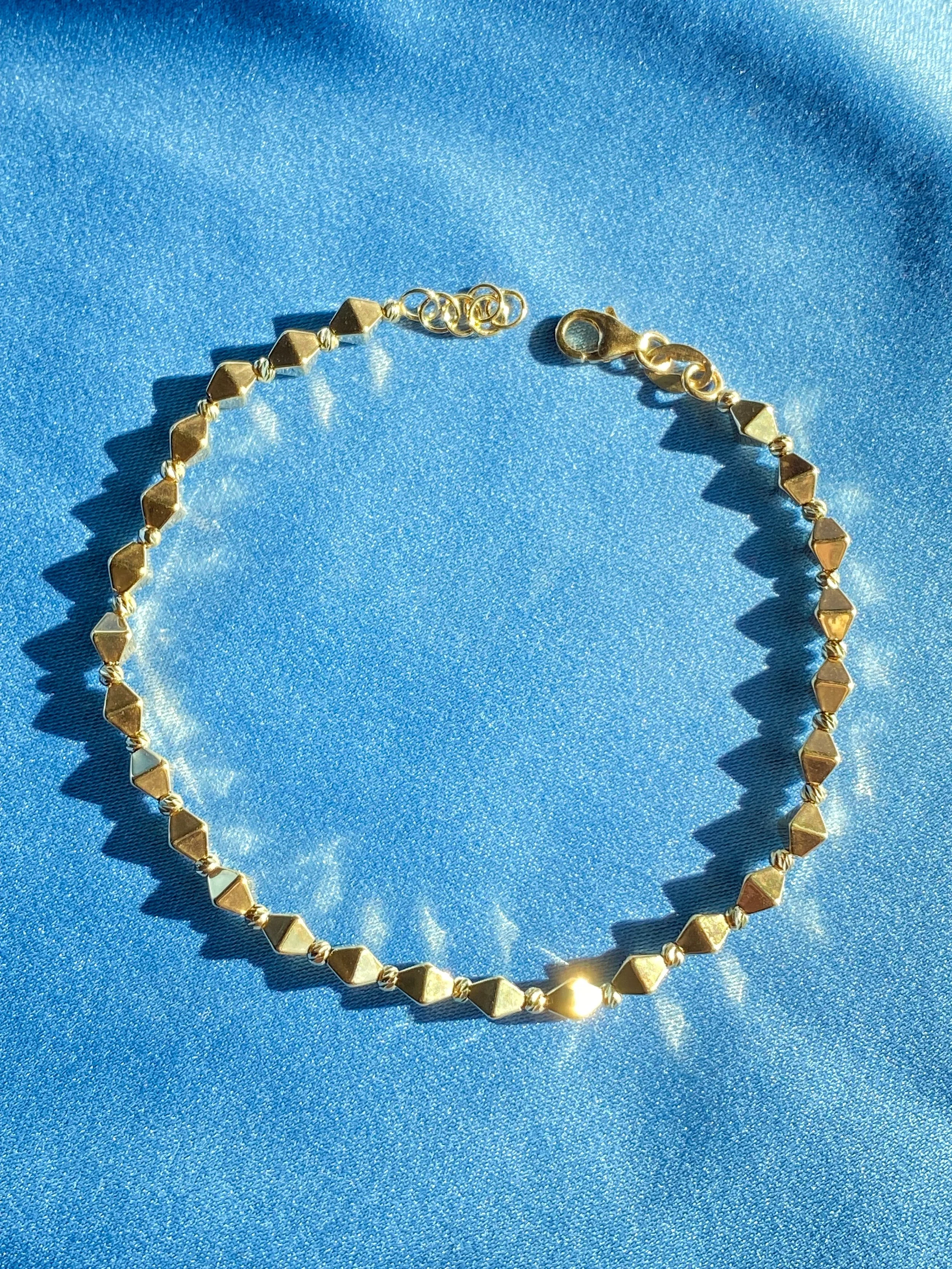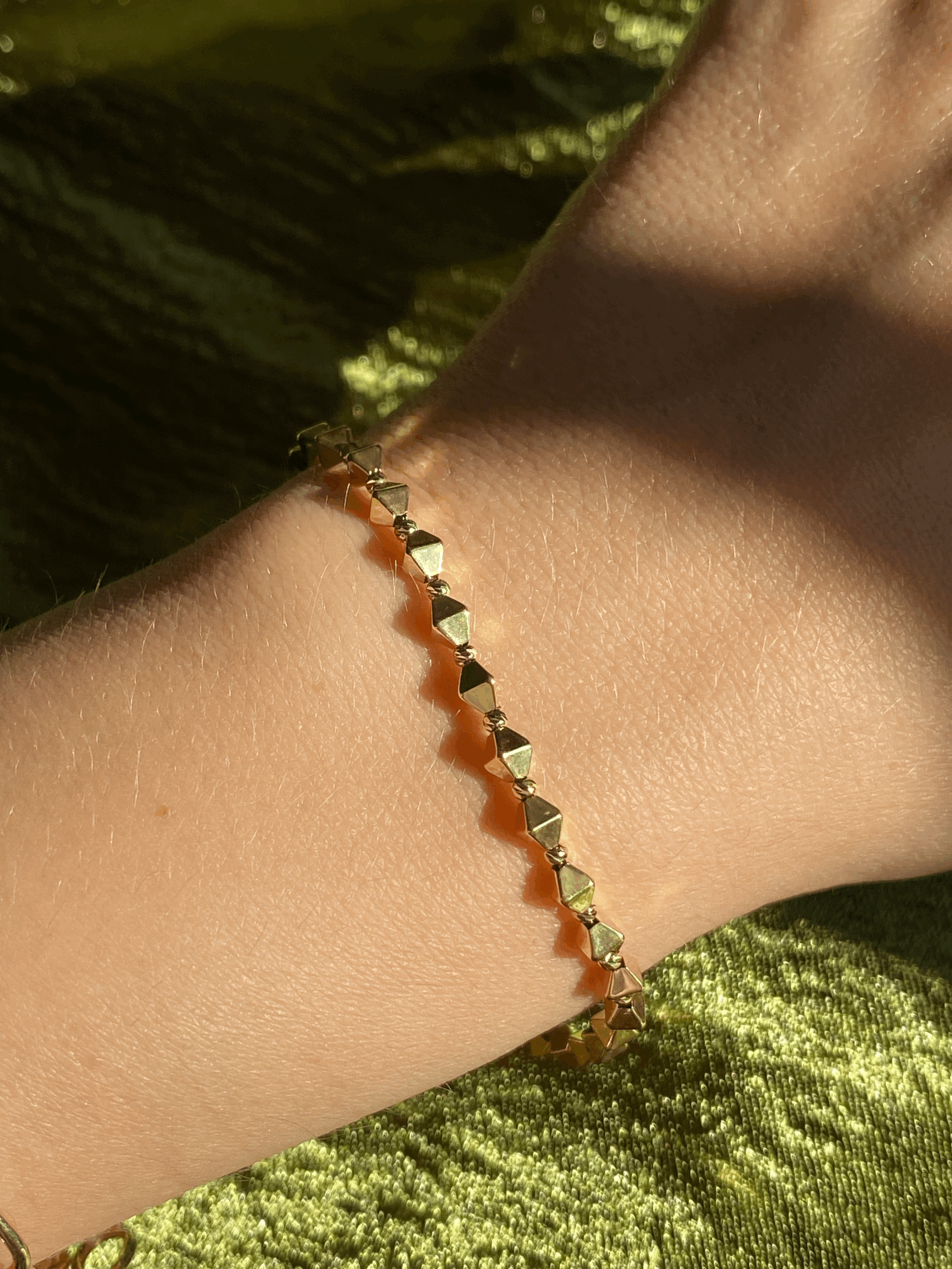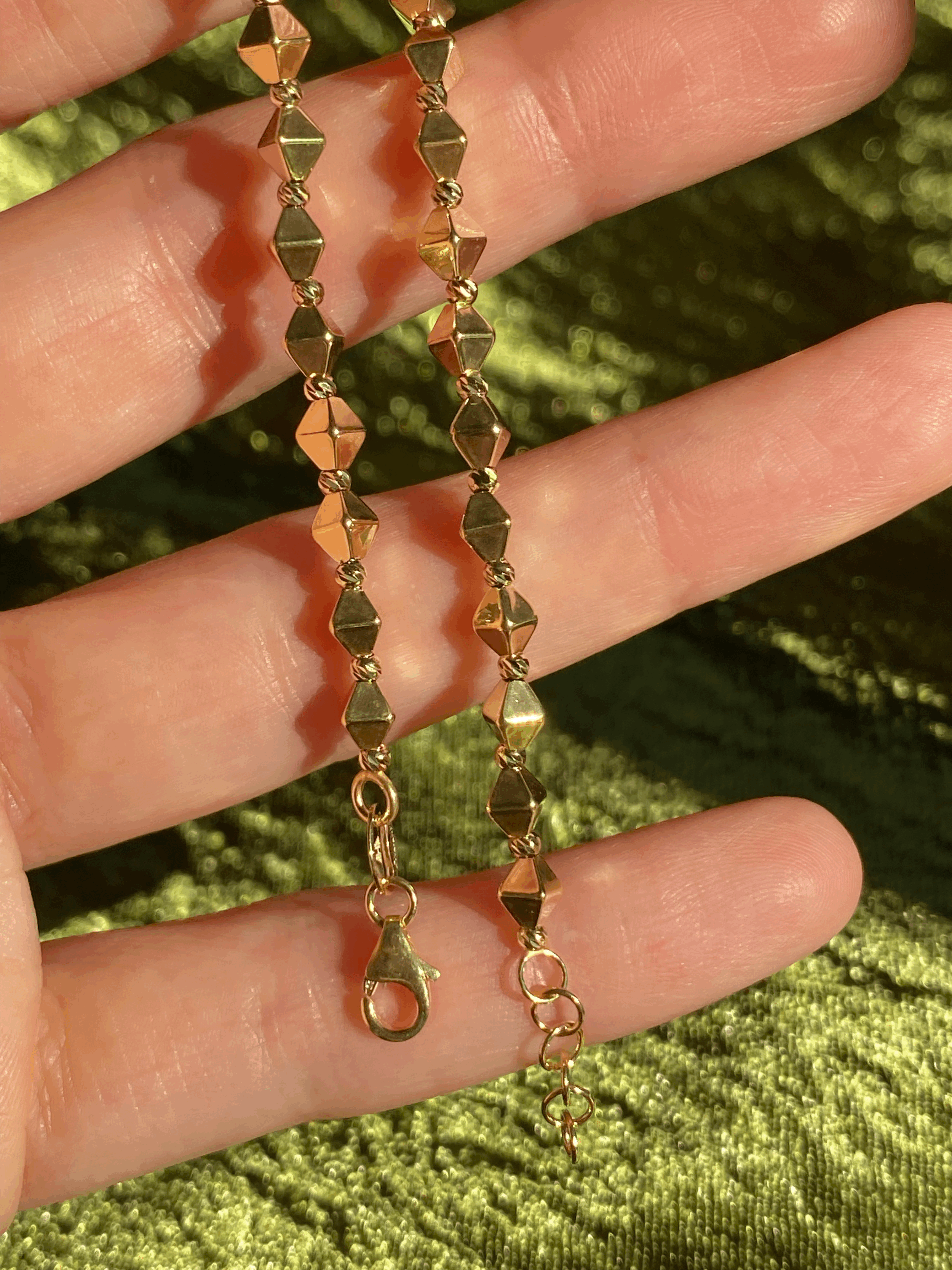 The pyramid beads are strung onto a gold chain, with tiny diamond cut beads in between. It has a subtle sparkle and daintiness that I love, with a rounded lobster claw clasp.